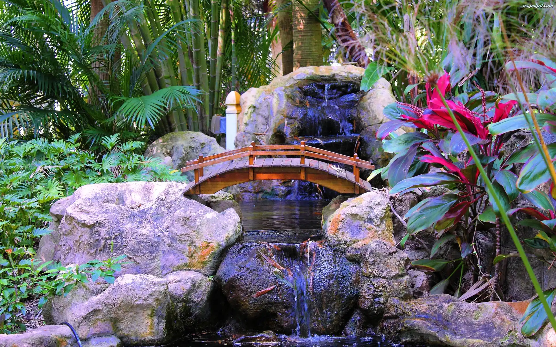 Rzeczka, Palmy, Kwiaty, Mostek, Park, Skały Na Pulpit