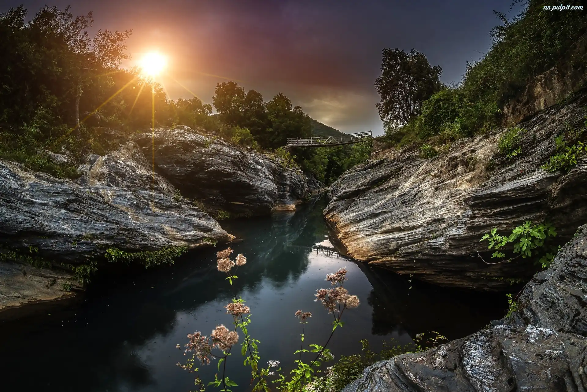 Rzeczka, Promienie, Słońca, Drzewa, Skały, Most