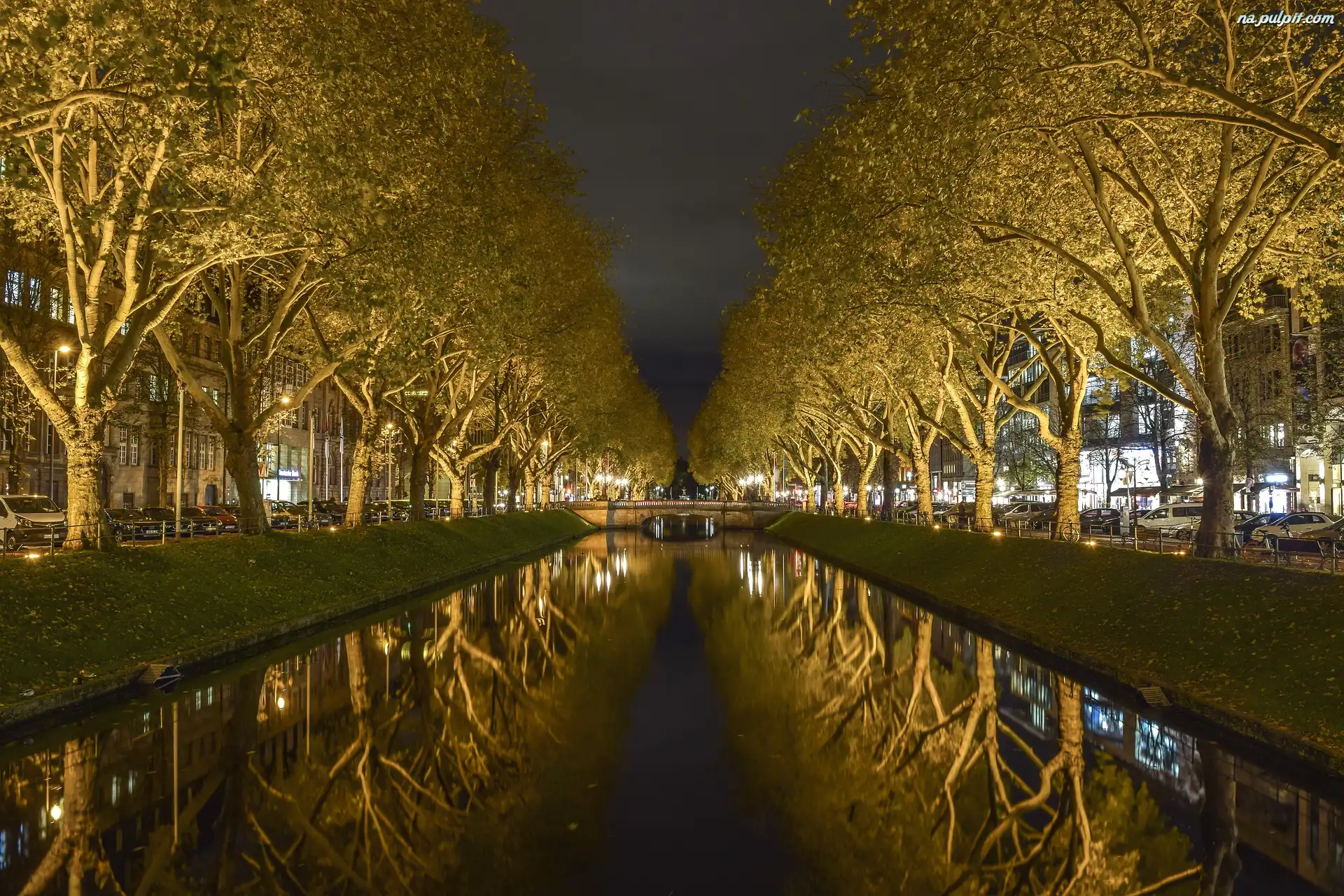 Rzeka, Kanał, Konigsallee, Aleja Królewska, Drzewa, Ulice, Domy, Dusseldorf, Niemcy, Most, Noc, Bulwar Na Pulpit |