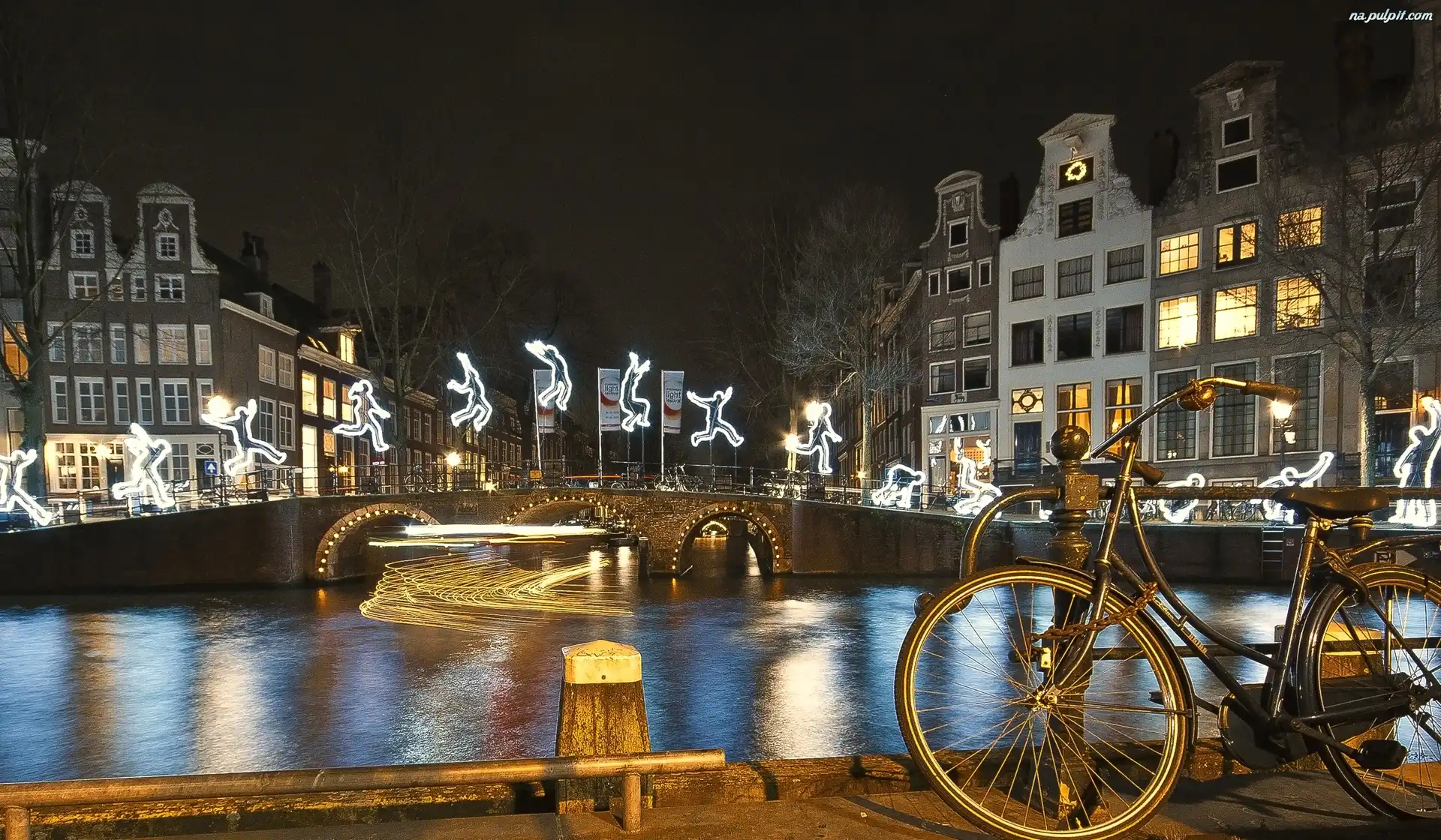 Amsterdam, Rzeka, Neony, Budynki, Rower, Miasto, Most