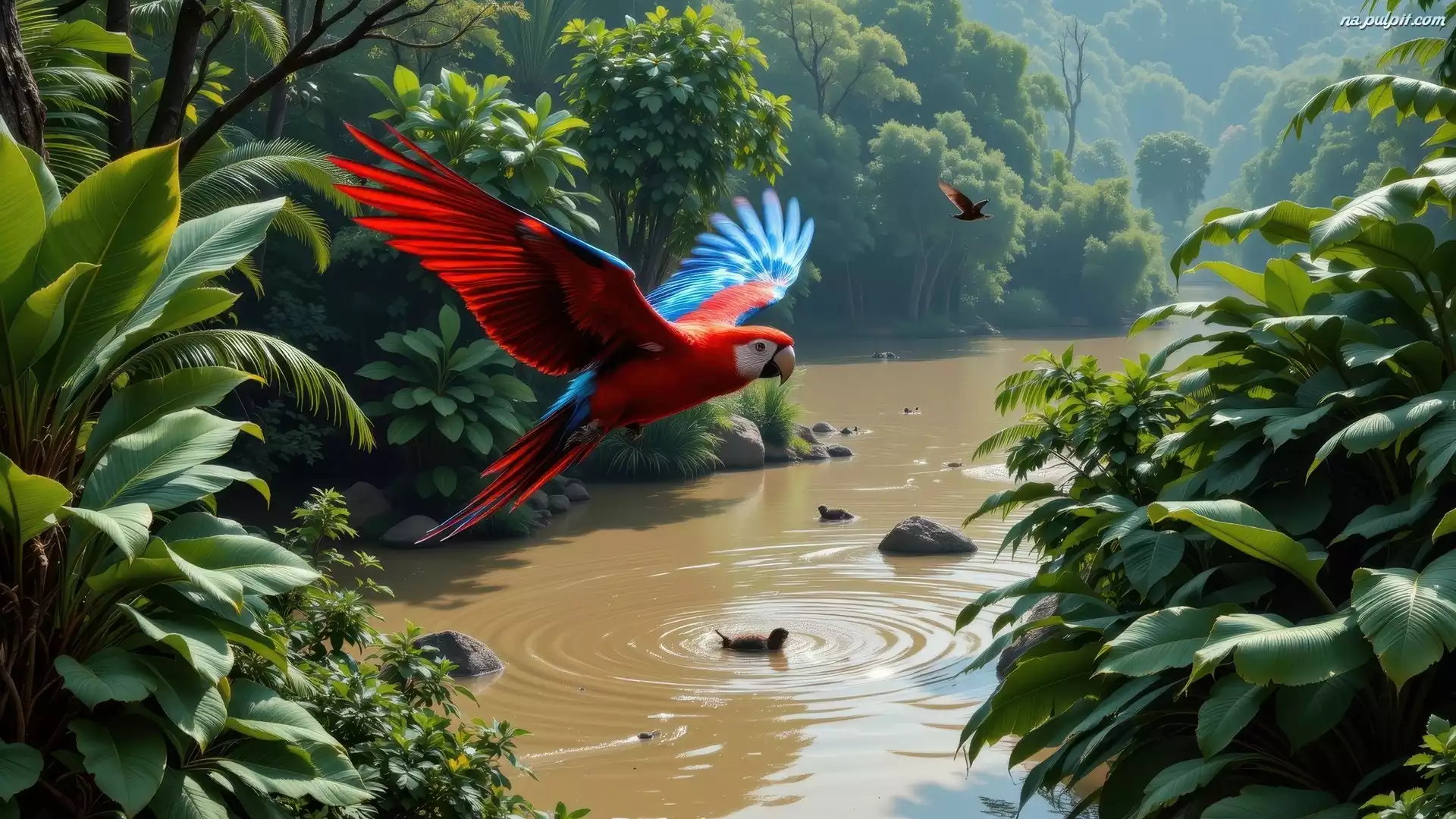 Rośliny, Lot, Ara, Rzeka, Fruwająca, Papuga, Zielone