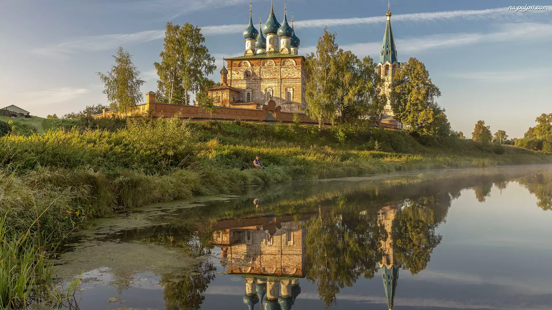 Wędkarz, Rzeka, Cerkiew, Odbicie, Drzewa