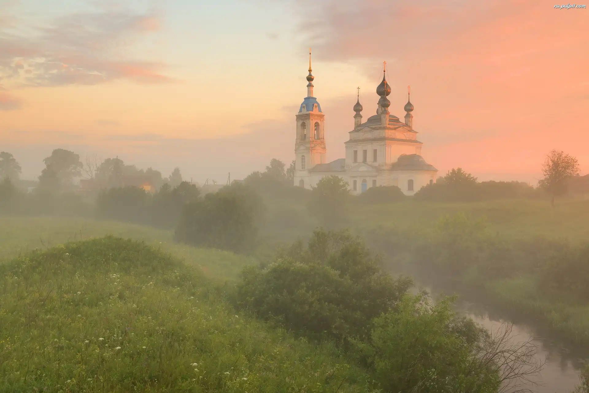 Cerkiew, Rzeka, Drzewa, Jesień, Wschód słońca, Mgła Na Pulpit