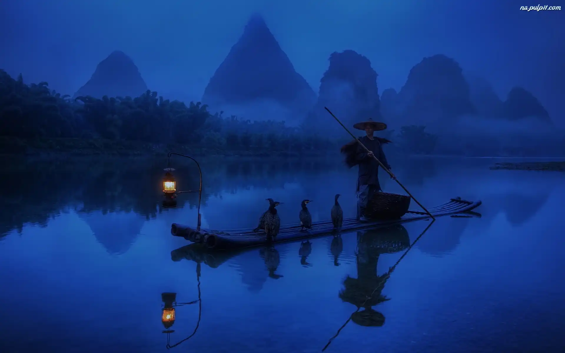 Łódka, Człowiek, Kormorany, Rzeka, Noc