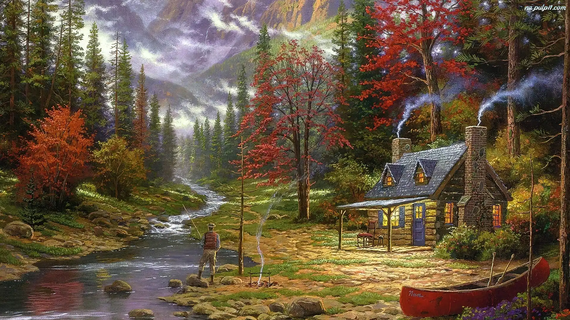 Świerk, Rzeka, Rybaka, Domek, Thomas Kinkade, Ogień, Góry, Drewno Na Pulpit
