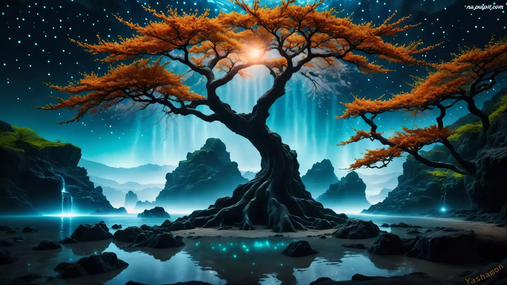 Niebo, Rzeka, Drzewa, Grafika, Kamienie