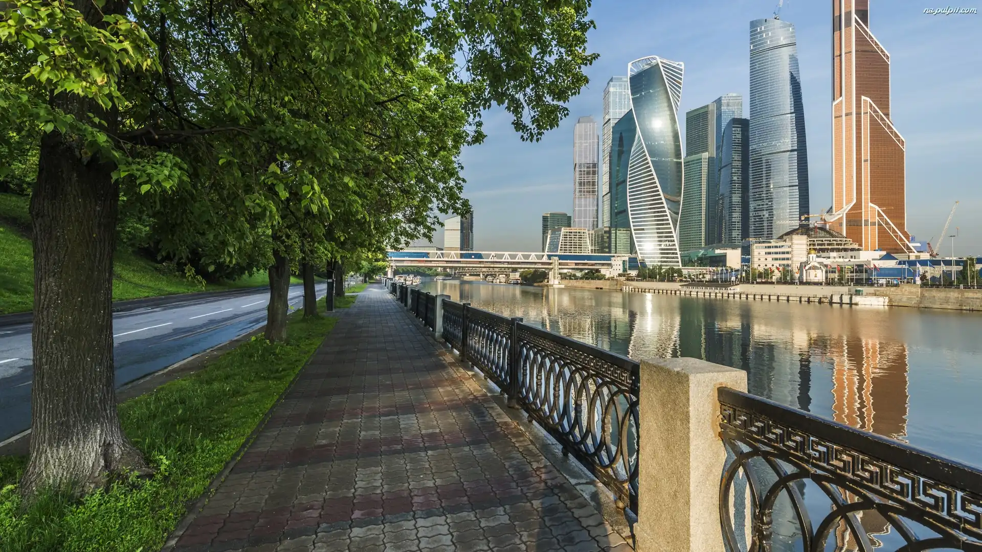 Rzeka, Moskwa, Rosja, Domy, Drzewa, Wieżowce Na Pulpit