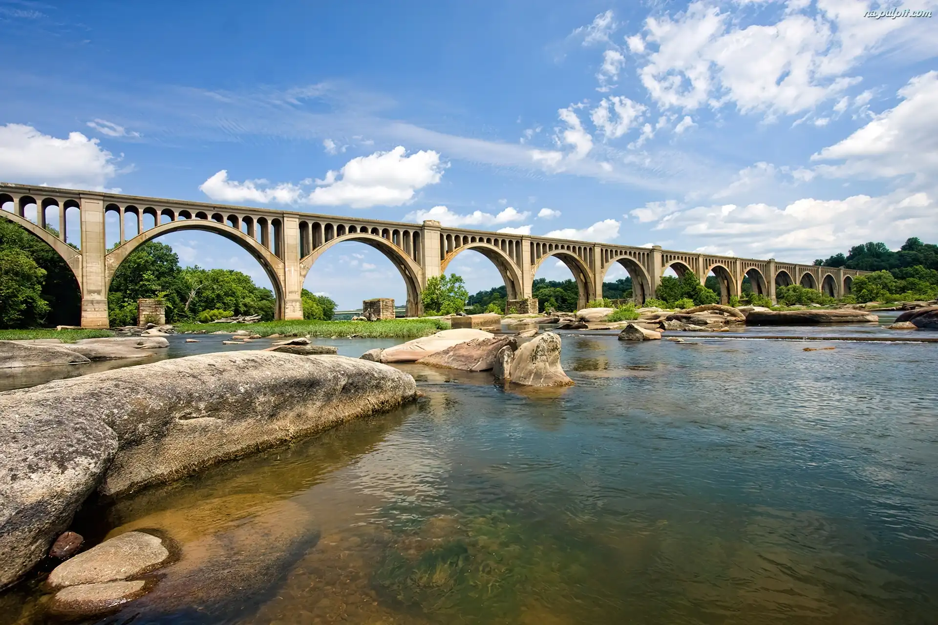 Rzeka, Niebo, Chmury, Most, Duża, Kamienie Na Pulpit