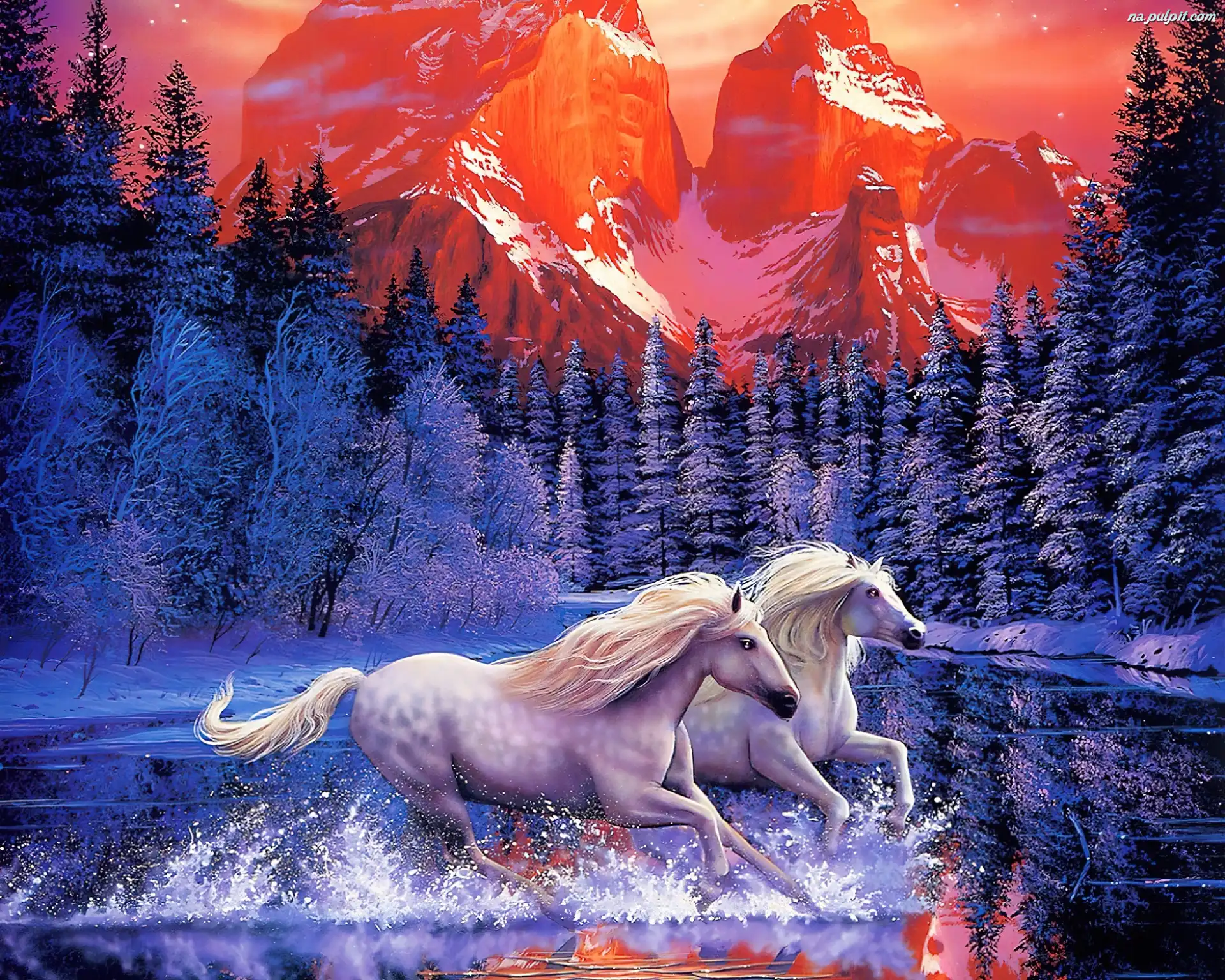 Rzeka, Las, Konie, Dwa, Góry Na Pulpit