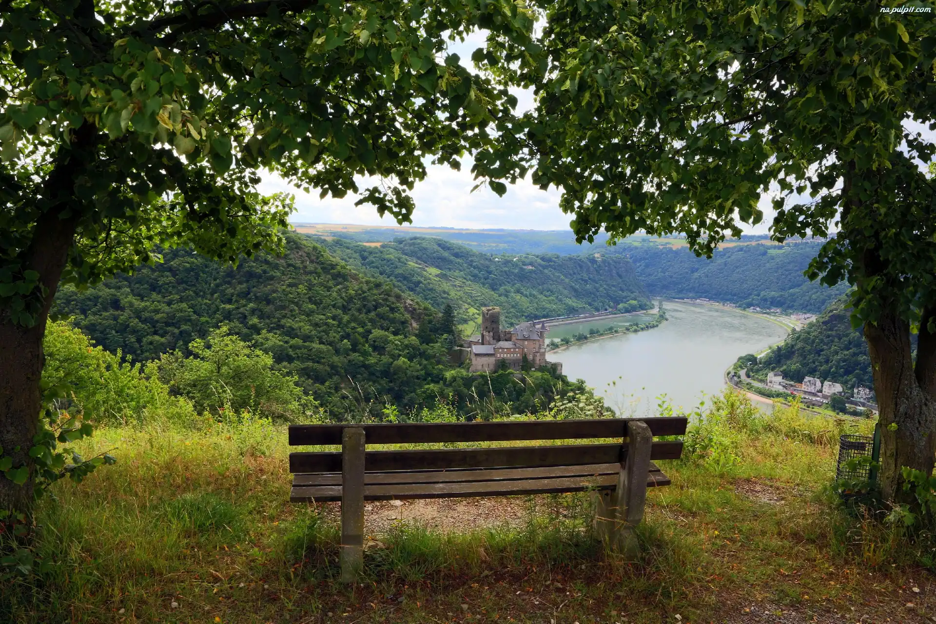 Ławka, Góry, Rzeka, Drzewa Na Pulpit