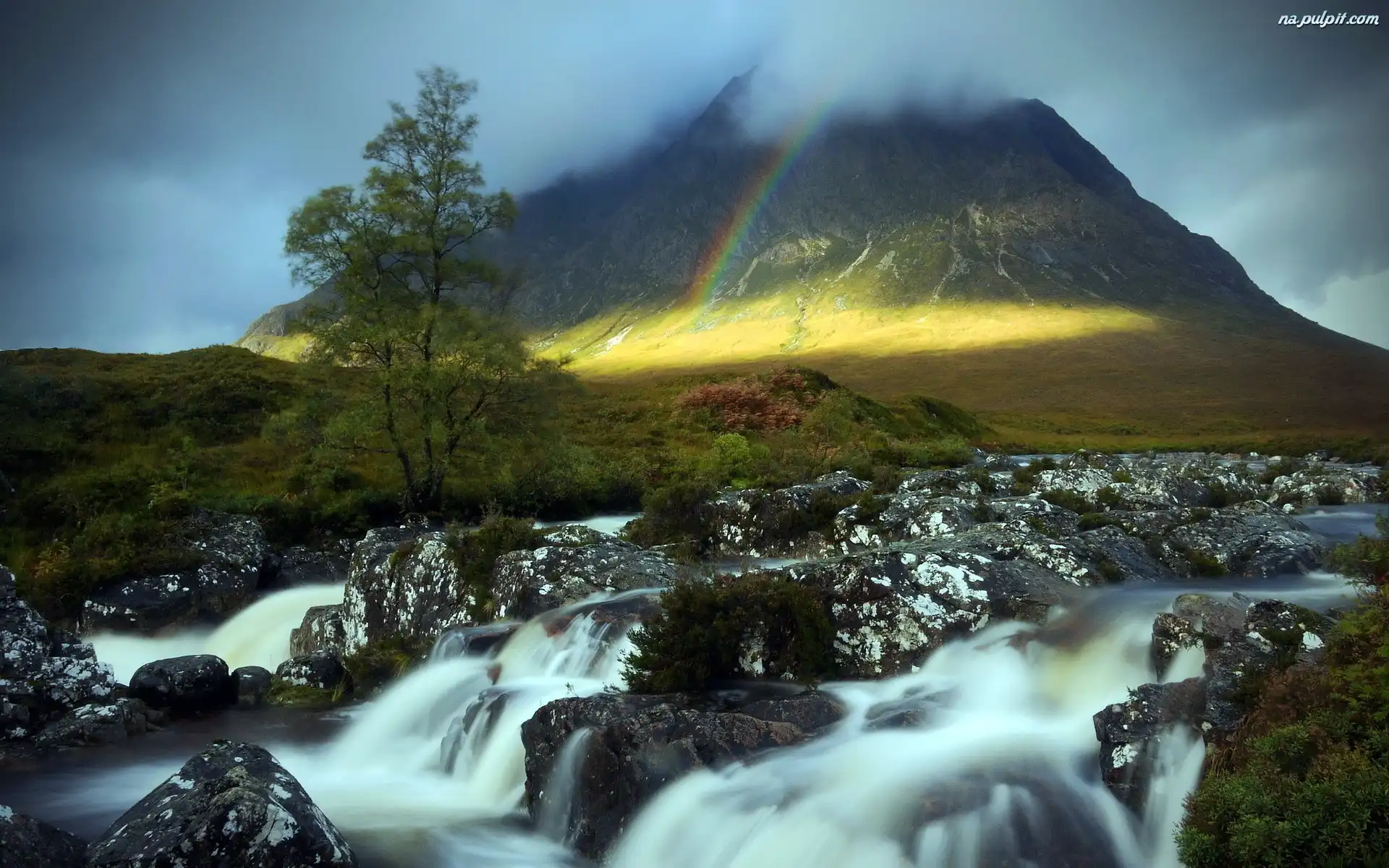 Rzeka, Tęcza, Mgła, Kamienie, Góry, Drzewo Na Pulpit