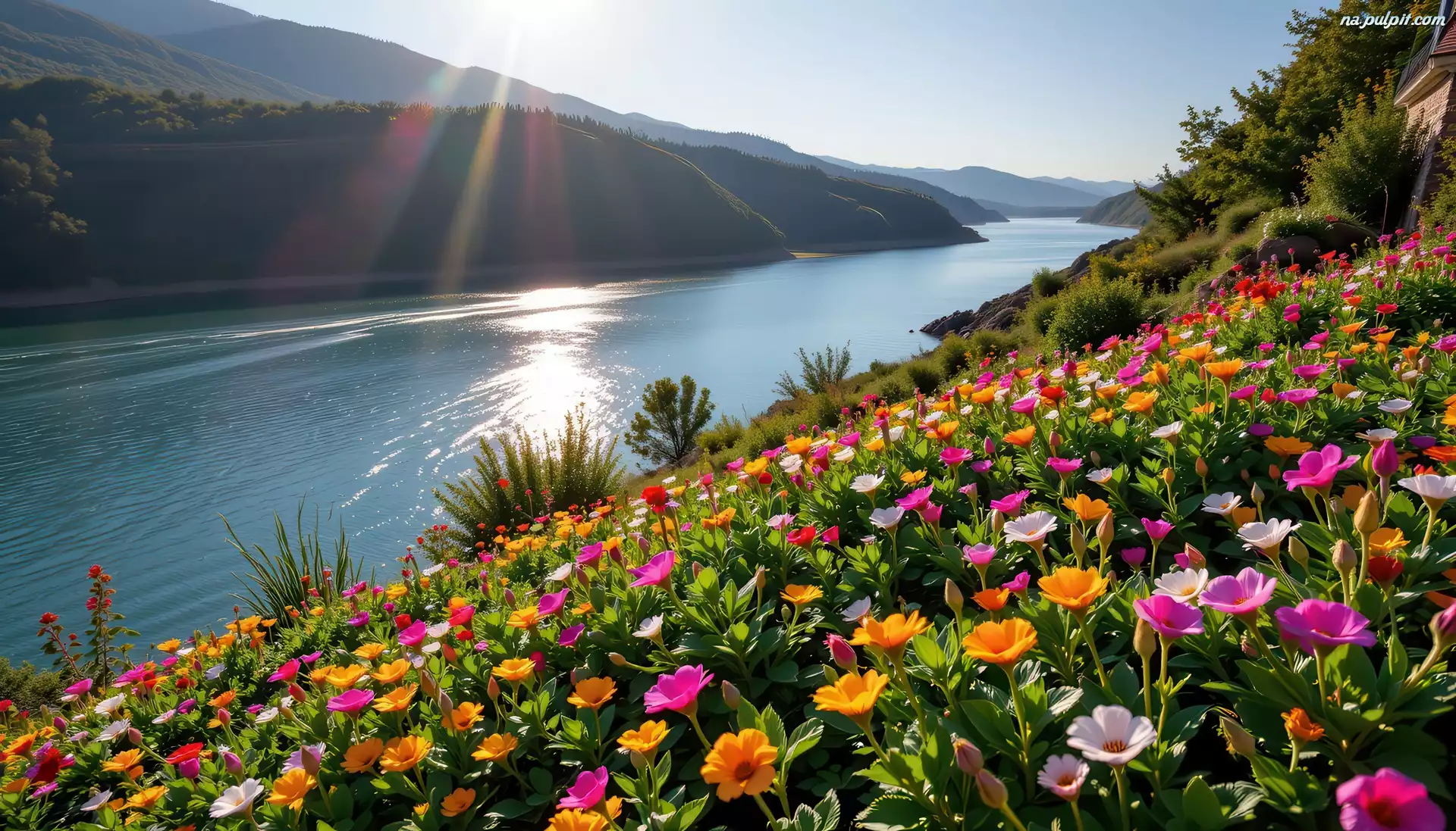 Góry, Kolorowe, Zbocze, Rzeka, Kwiaty, Grafika Na Pulpit