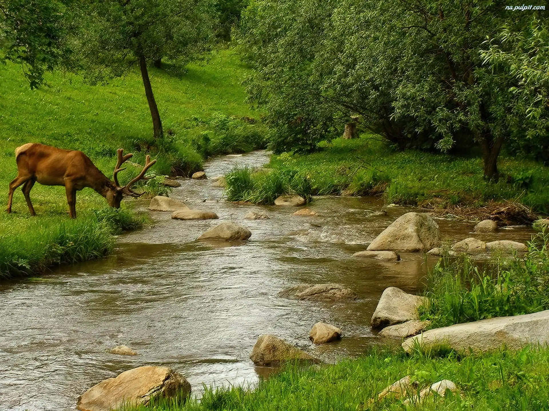Rzeka, Las, Jeleń, Łąka Na Pulpit