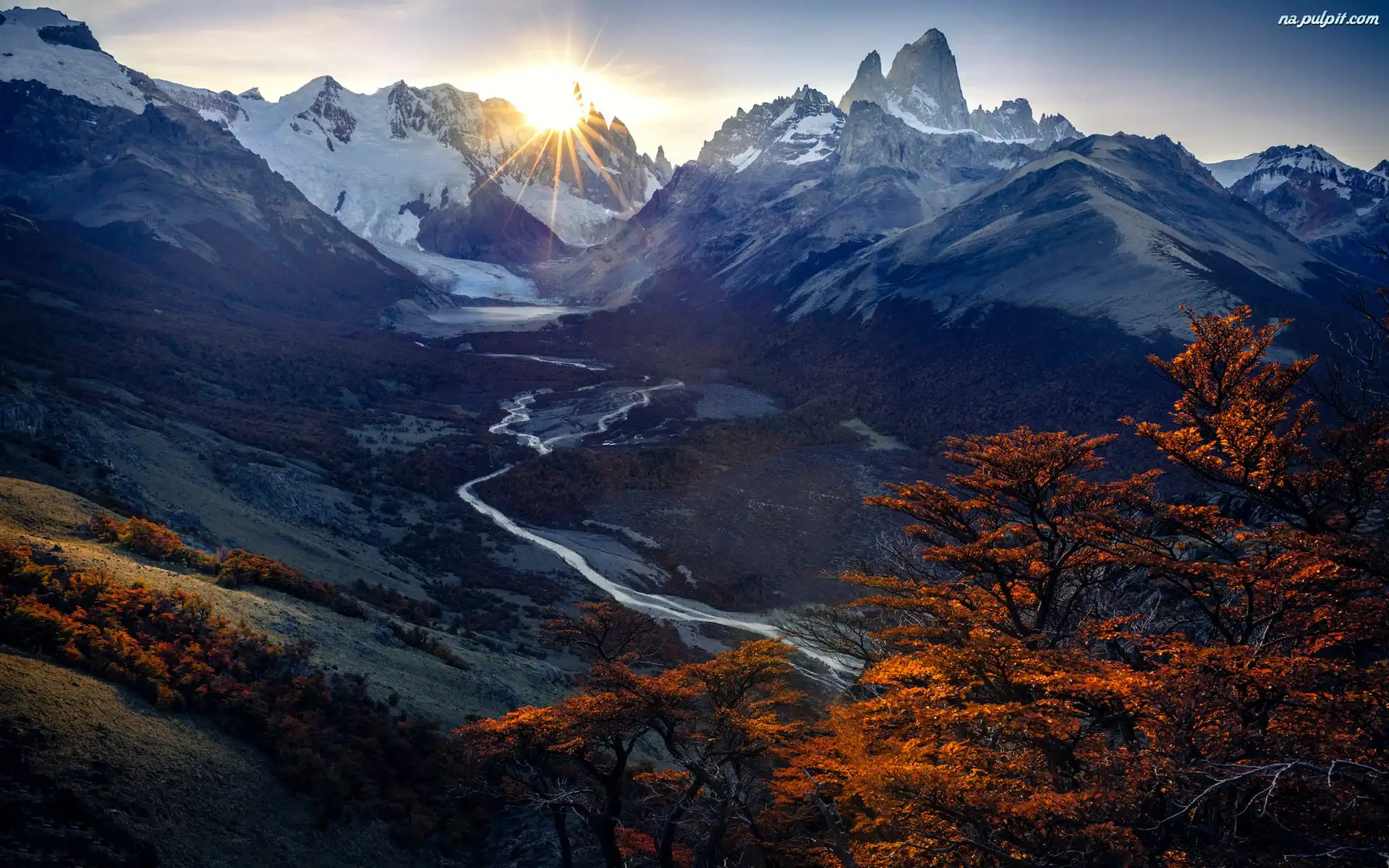 Rzeka, Góry, Promienie słońca, Argentyna, Drzewa, Jesień, Patagonia, Andy Na Pulpit