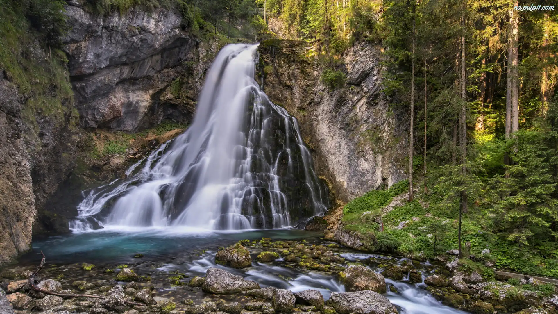 Rzeka, Drzewa, Skały, Kamienie, Salzburg, Miejscowość Golling, Austria, Las, Wodospad Gollinger Waterfall, Roślinność Na Pulpit |