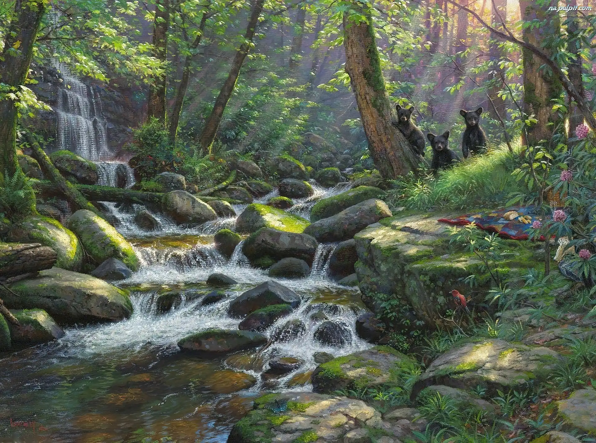 Rzeka, Trzy, Niedźwiadki, Wodospad, Las, Kamienie Na Pulpit
