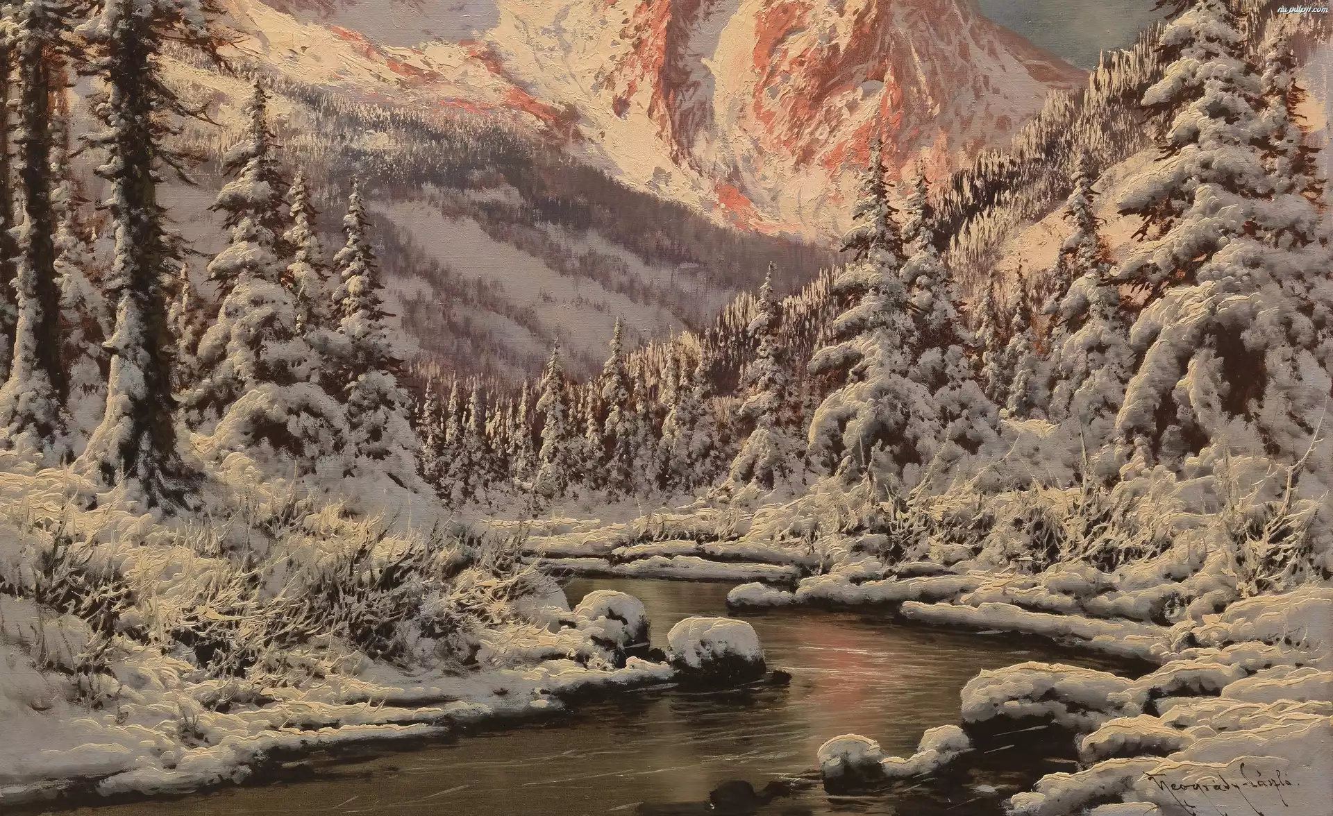 Góry, Obraz, Laszlo Neogrady, Ośnieżone, Drzewa, Zima, Malarstwo, Rzeka Na Pulpit