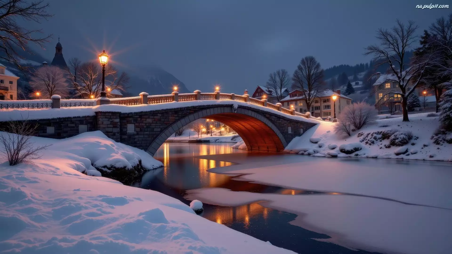 Śnieg, Most, Latarnie, Zima, Domy, Drzewa, Noc, Rzeka Na Pulpit