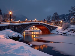 Śnieg, Most, Latarnie, Zima, Domy, Drzewa, Noc, Rzeka