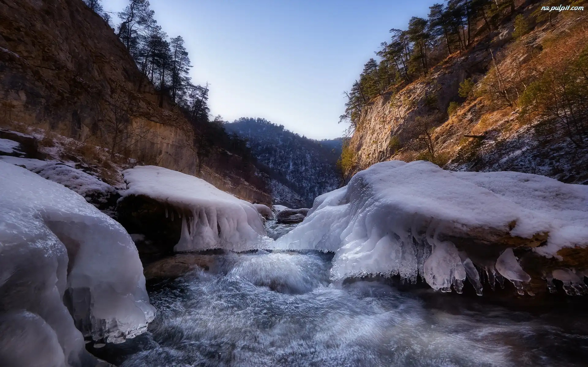 Lód, Karaczajo-Czerkiesja, Wąwóz Marukh, Rzeka Marukha, Drzewa, Zima, Oblodzone, Rosja, Skały Na Pulpit |