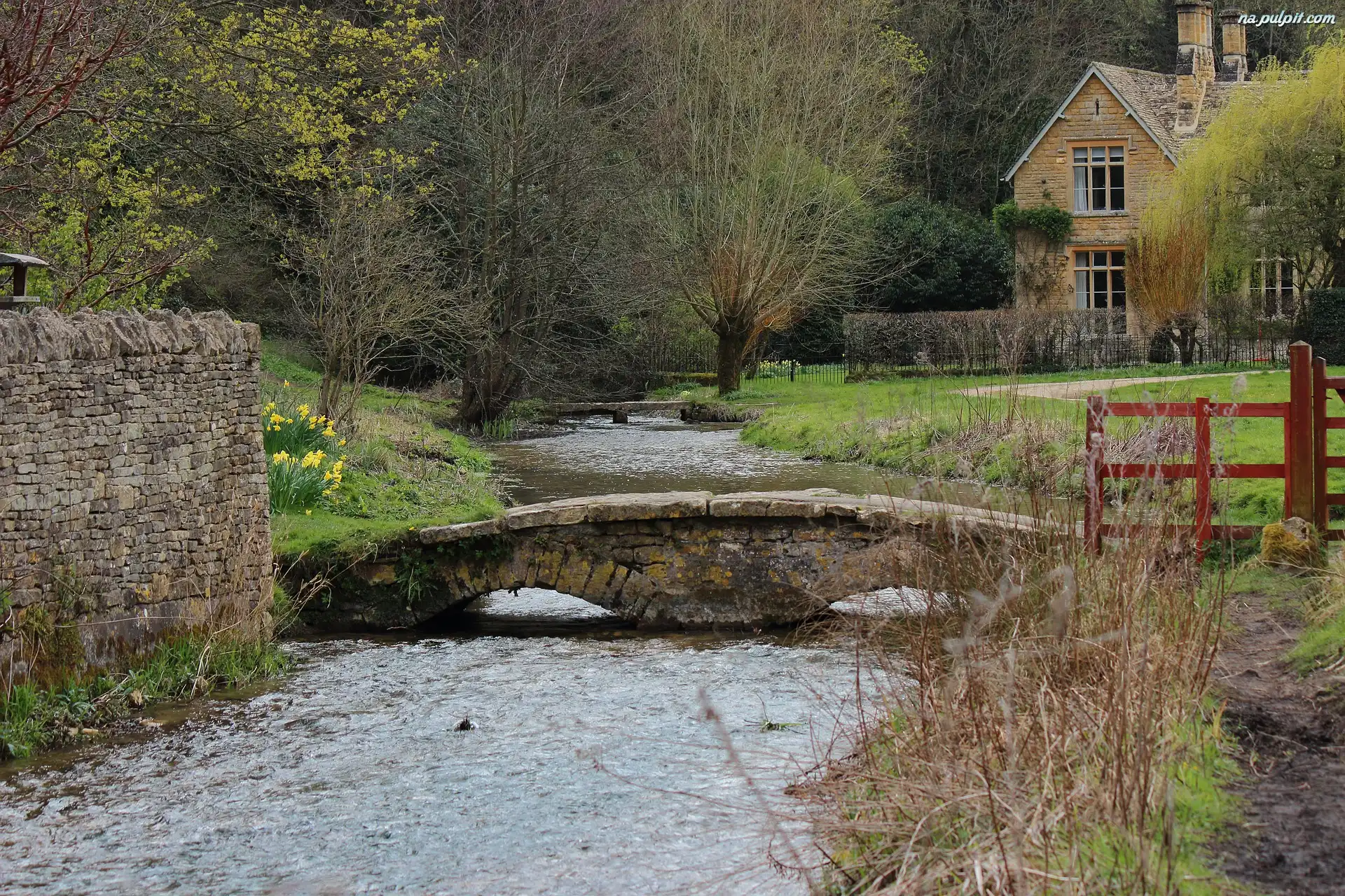 Drzewa, Rzeka, Mostki, Wiosna, Dom Na Pulpit