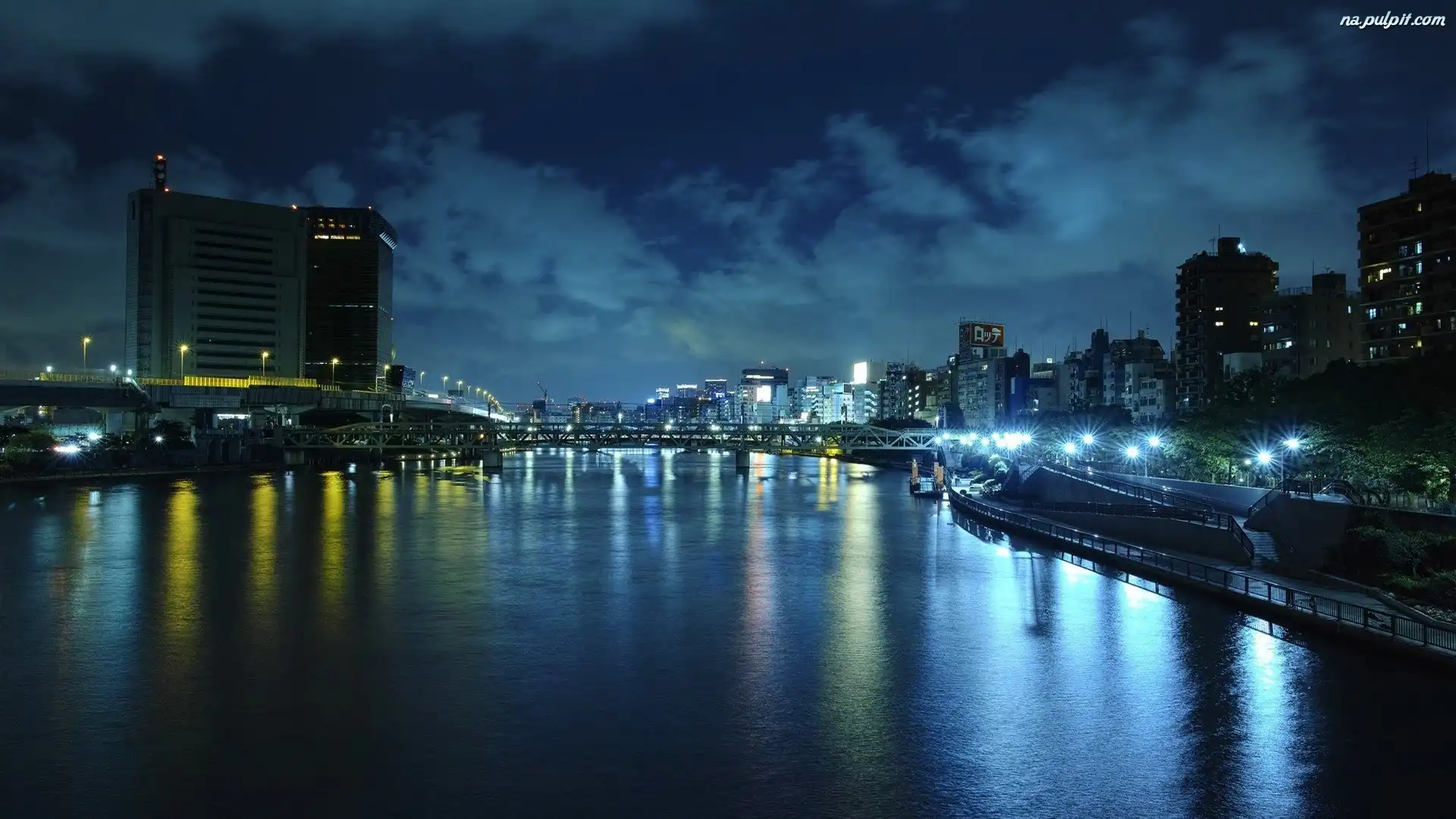 Rzeka, Noc, Odbicie, Most, Niebo, Miasto Na Pulpit