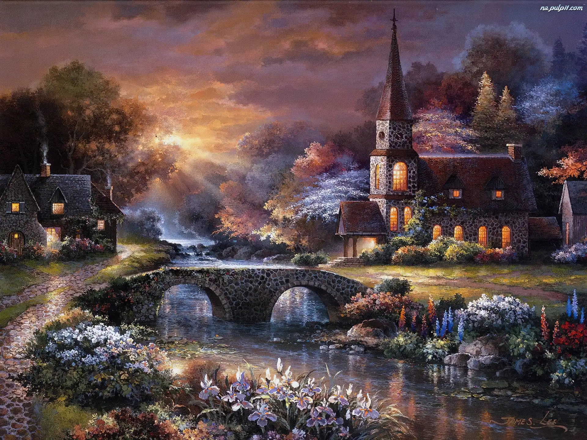 Rzeka, Kościółek, James Lee, Obraz, Mostek