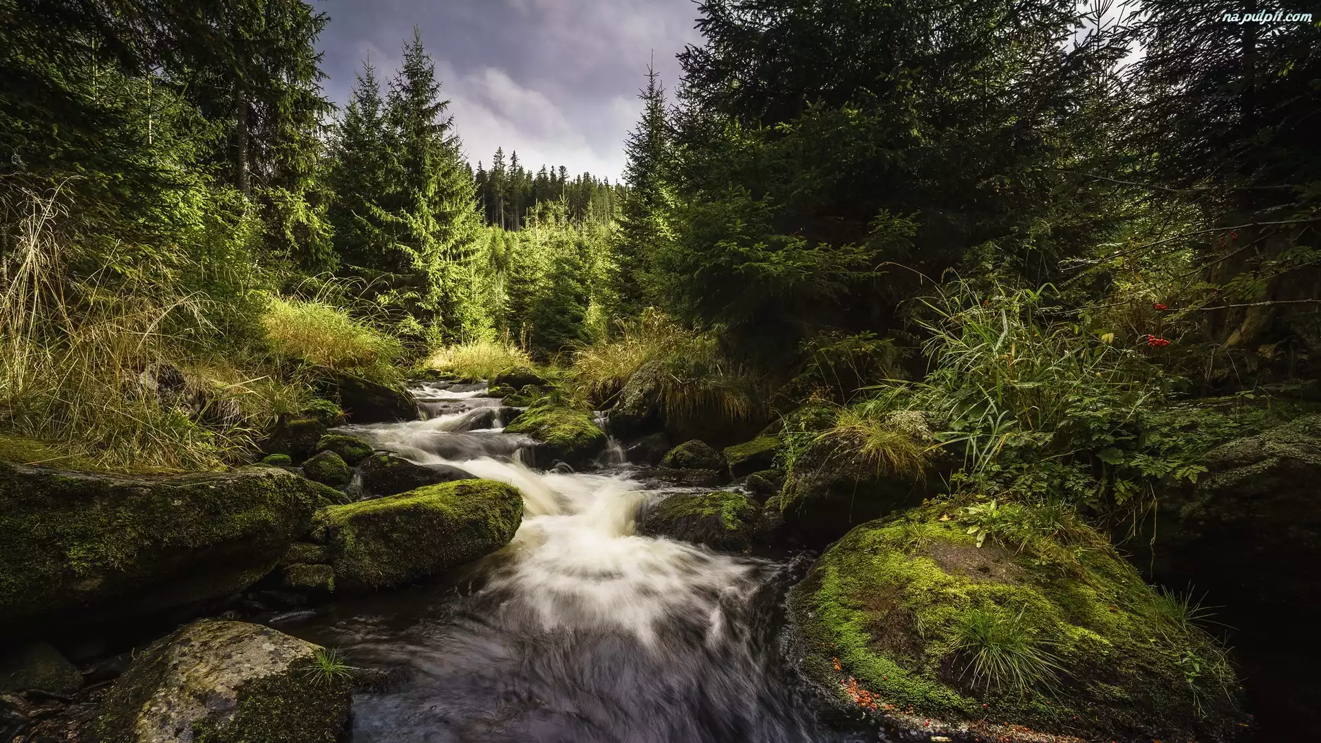 Drzewa, Rzeka, Omszałe, Rośliny, Kamienie Na Pulpit
