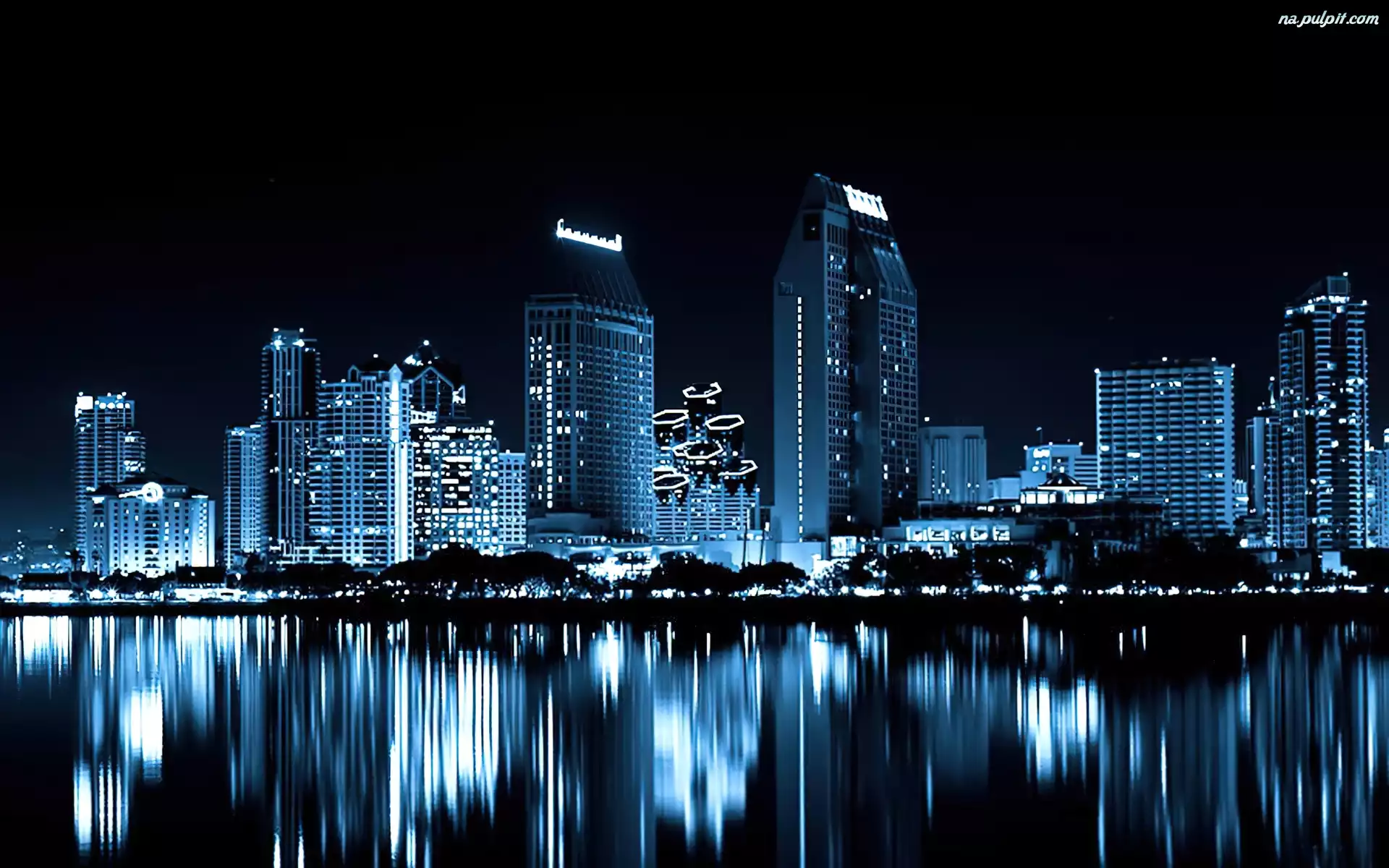 Rzeka, Miasto, Podświetlone, Nocą Na Pulpit
