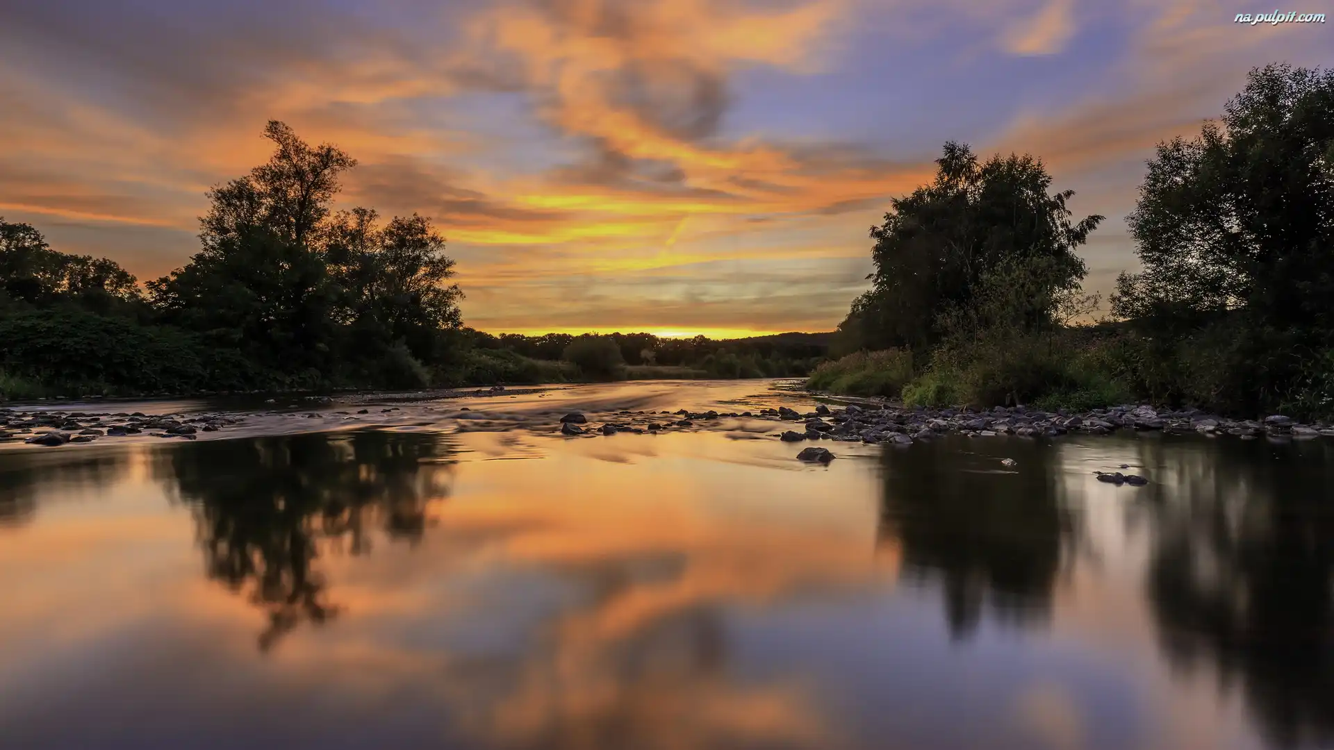 Pomarańczowe, Rzeka, Drzewa, Niebo, Zachód słońca, Chmury Na Pulpit