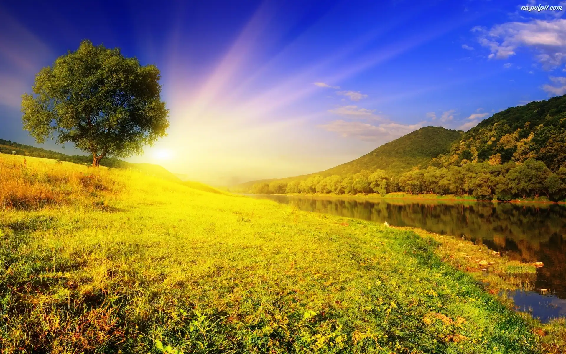 Rzeka, Łąki, Słońca, Promienie, Góry