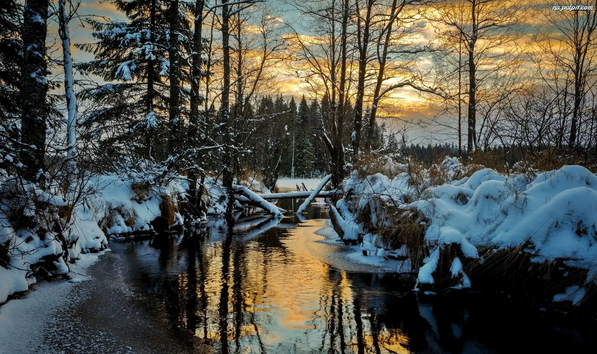 Region Värmland, Drzewa, Wschód słońca, Zima, Szwecja, Rzeka Na Pulpit