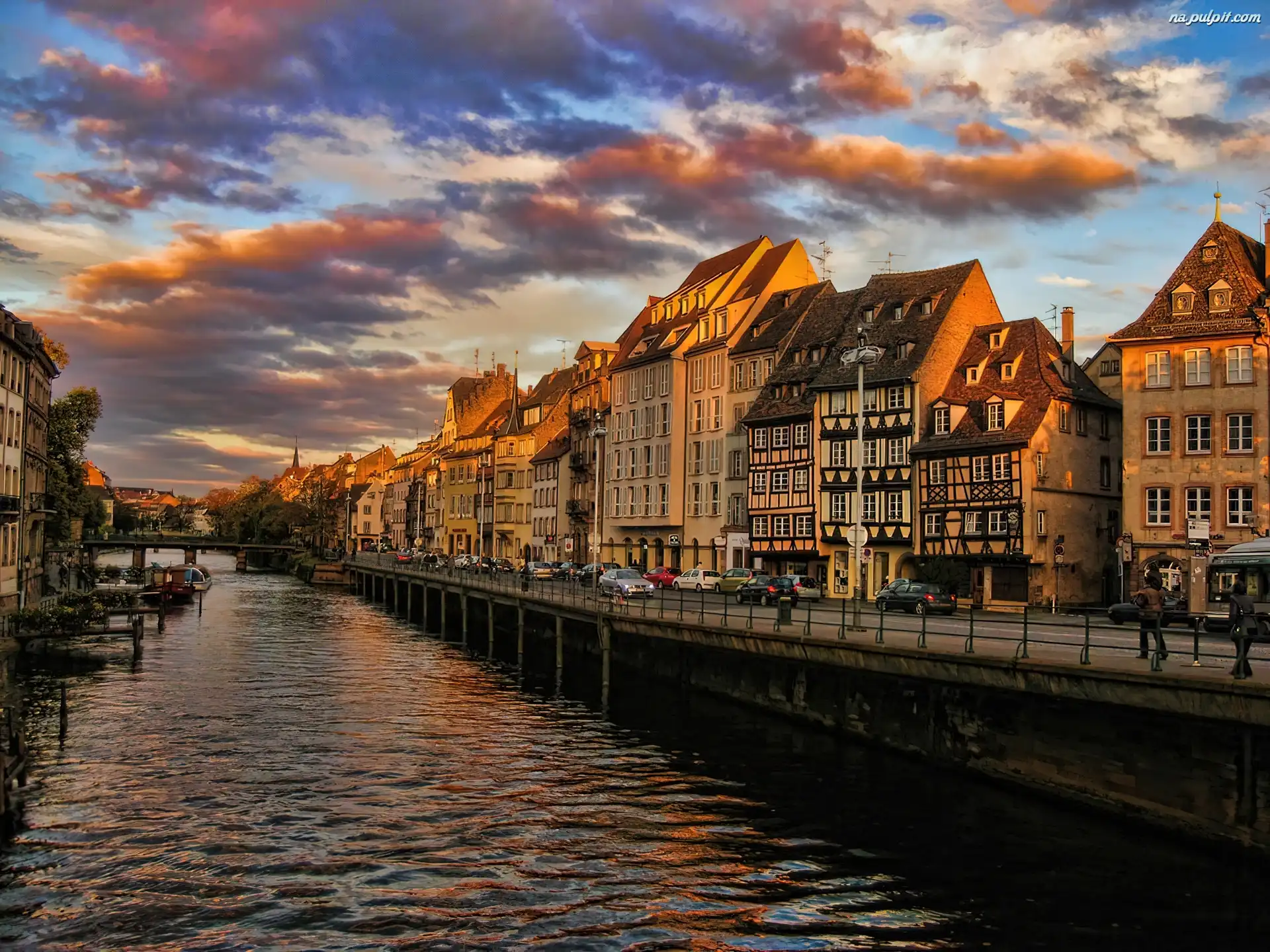 Rzeka, Zachód, Słońca, Ill, Strasburg, Kamienice