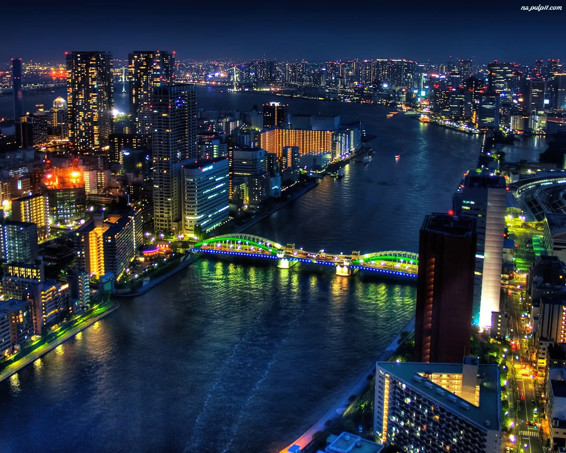 Rzeka, Noc, Miasto, Tokio, Most
