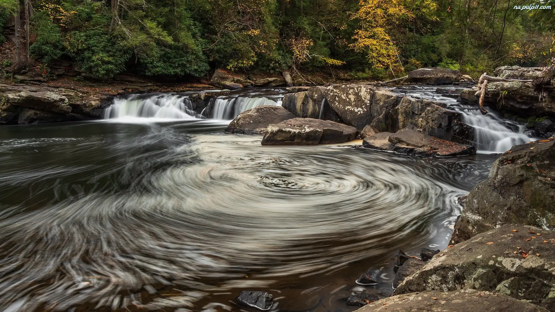 Rzeka, Skały, Youghiogheny River, Drzewa, Stany Zjednoczone, Maryland, Wir, Uskok