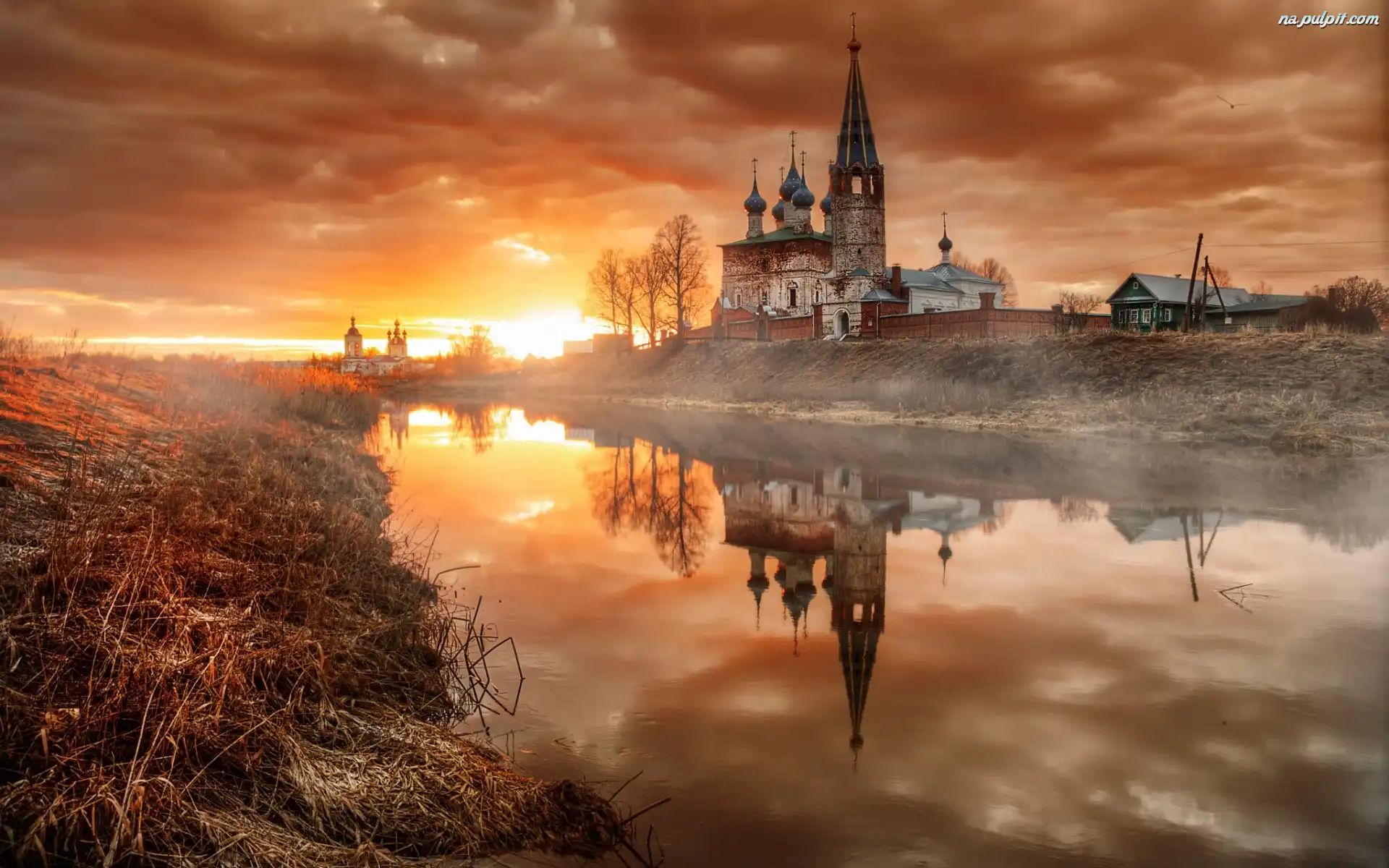 Drzewa, Dunilovo, Wschód, Słońca, Domy, Odbicie, Świątynia, Rosja, Rzeka
