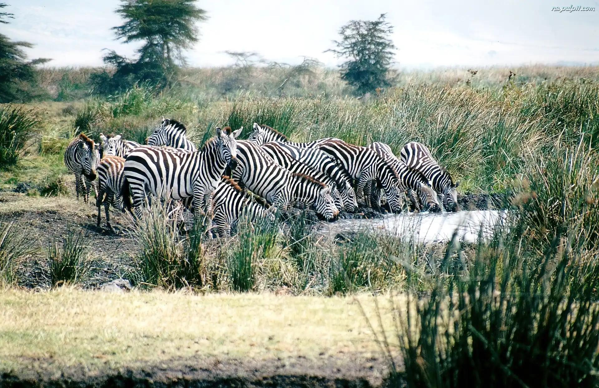 rzeka, drzewa, trawa, zebry, wodopój Na Pulpit