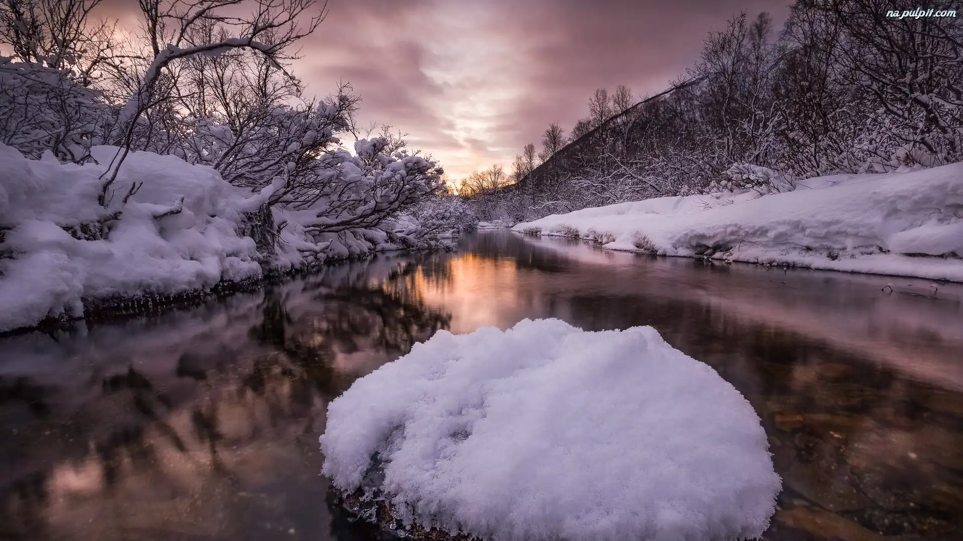 Rzeka, Drzewa, Chmury, Ośnieżone, Zima, Gałęzie Na Pulpit
