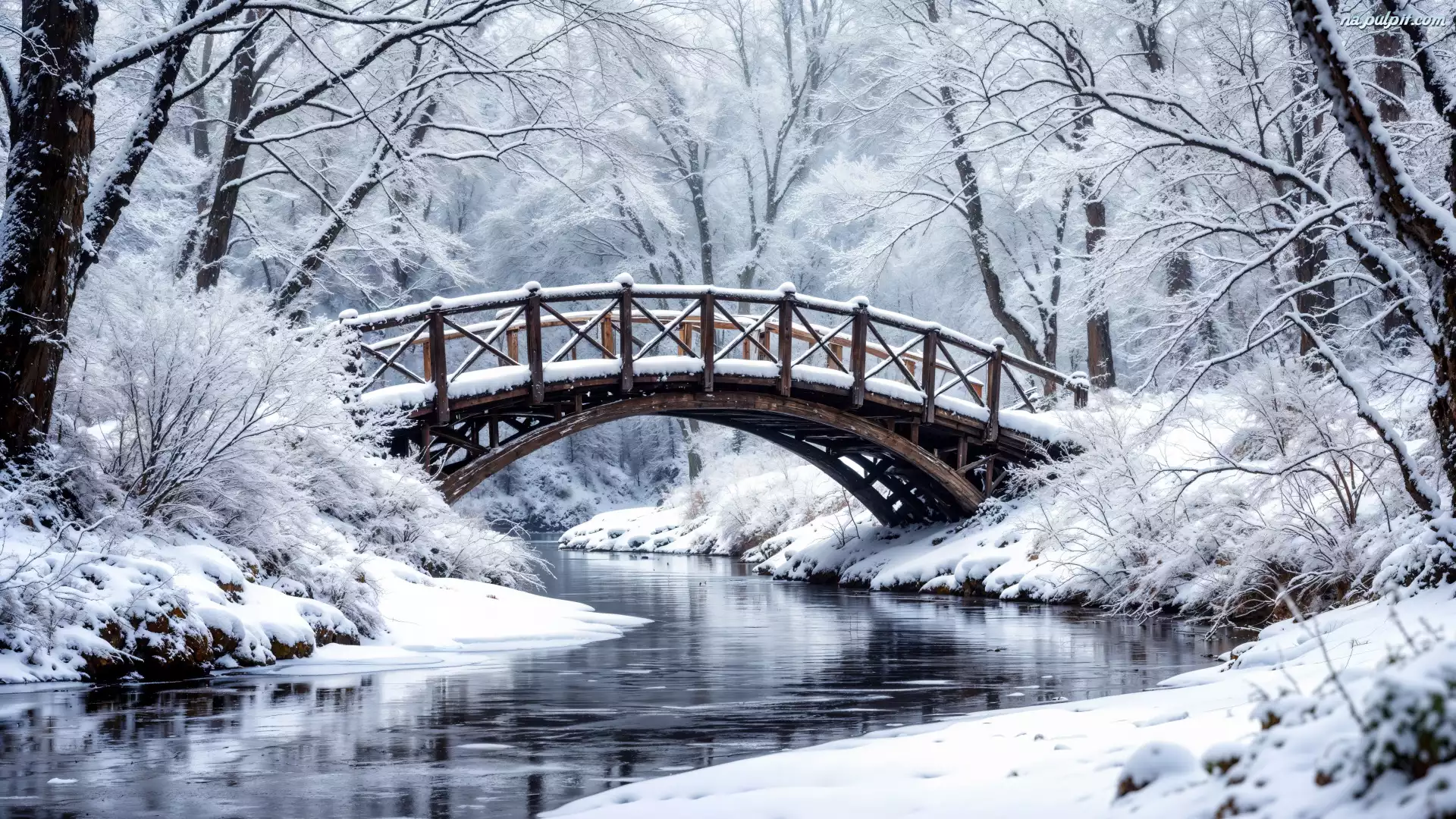 Zima, Drzewa, Most, Rzeka Na Pulpit