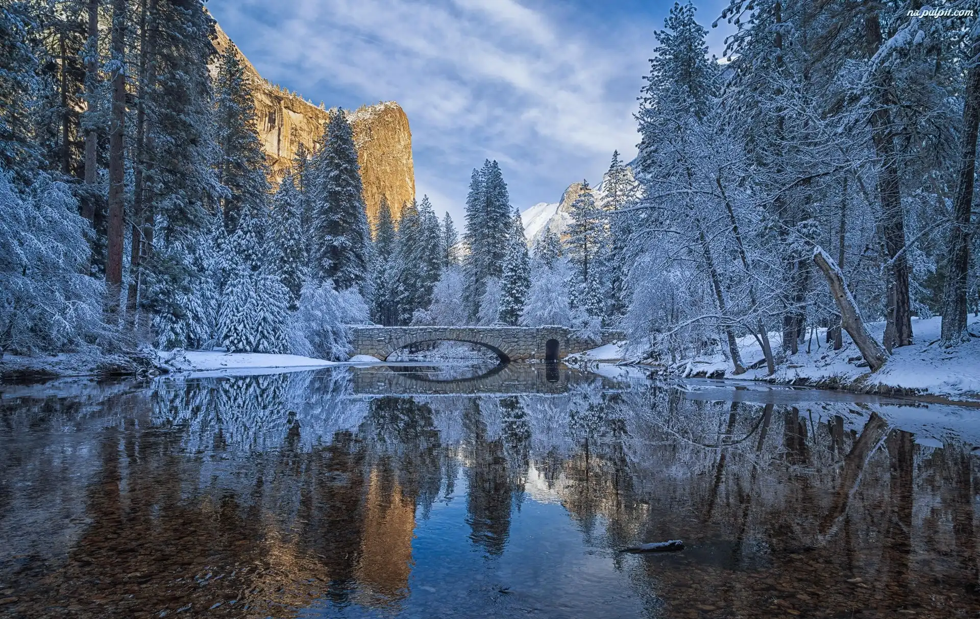 Rzeka, Góry, Odbicie, Most, Zima, Drzewa Na Pulpit