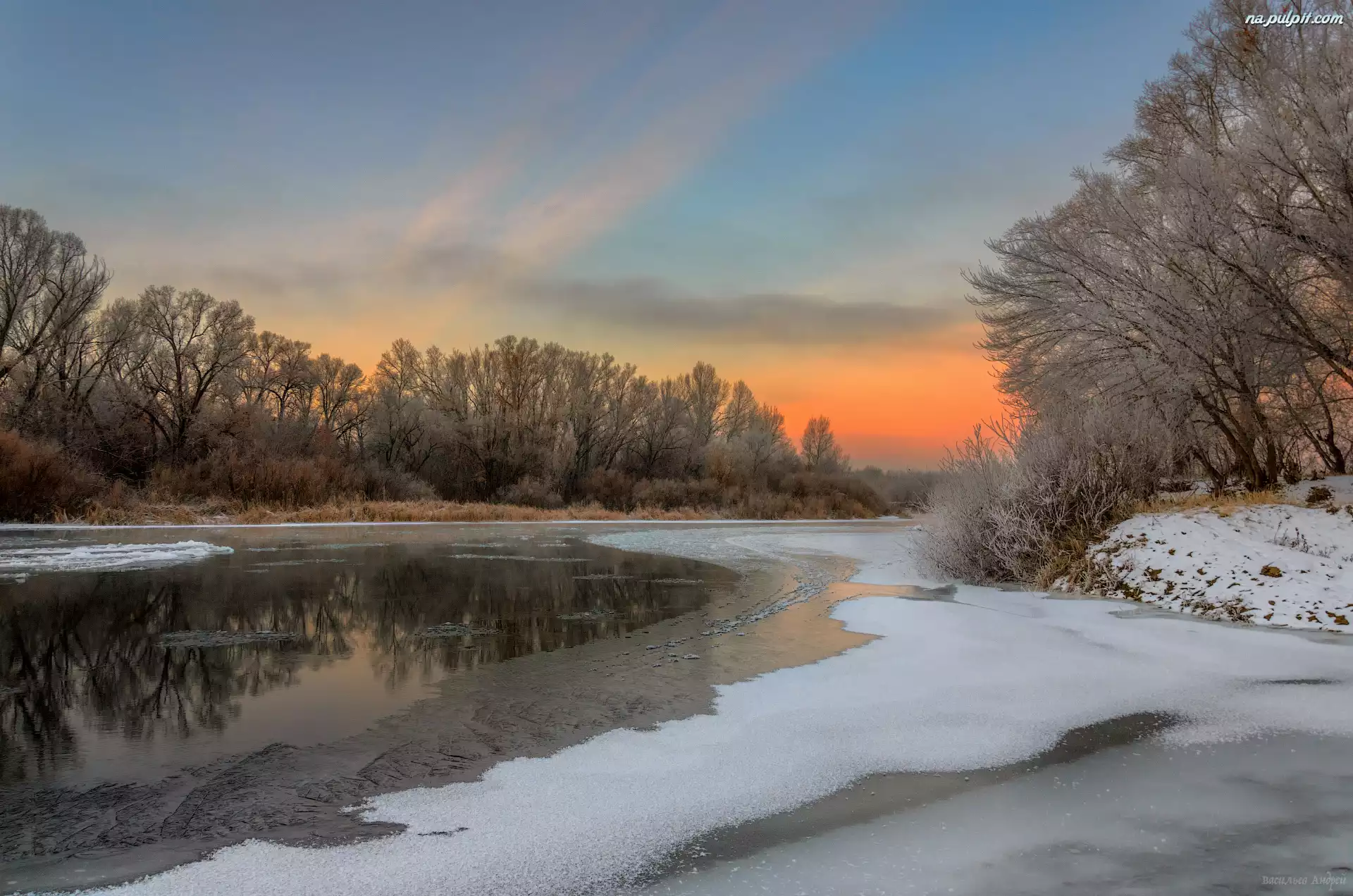 Wschód słońca, Zima, Rzeka, Drzewa, Śnieg, Poranek Na Pulpit