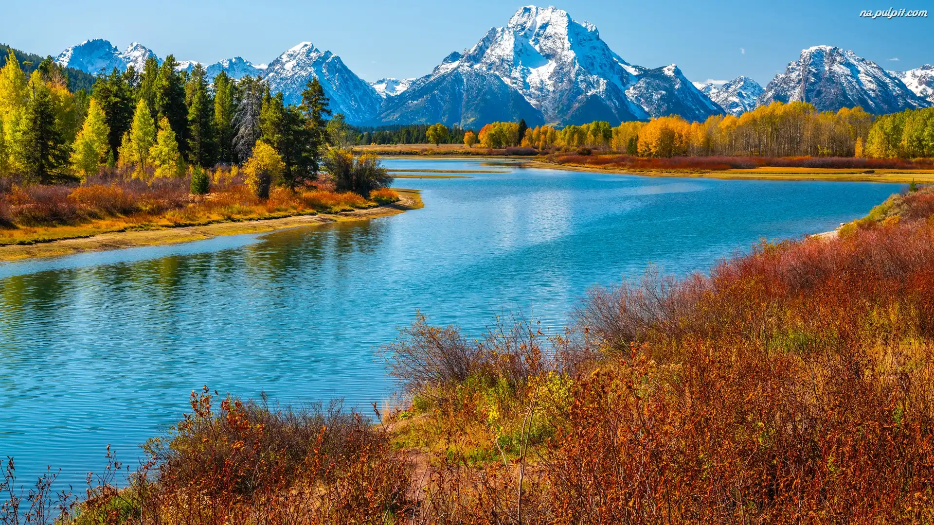 Rzeka, Drzewa, Góry, Snake River, Jesień, Stan Wyoming, Stany Zjednoczone, Teton Range, Park Narodowy Grand Teton, Trawy Na Pulpit |
