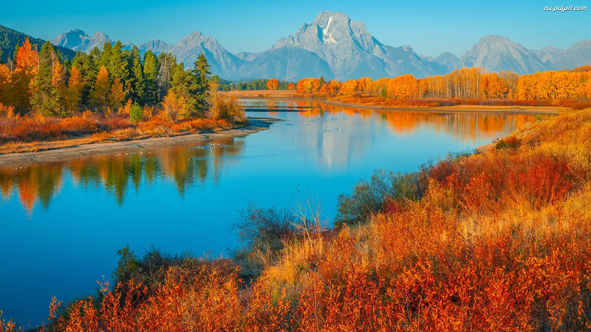 Rzeka, Drzewa, Góry, Snake River, Jesień, Stan Wyoming, Stany Zjednoczone, Teton Range, Park Narodowy Grand Teton, Trawa Na Pulpit |