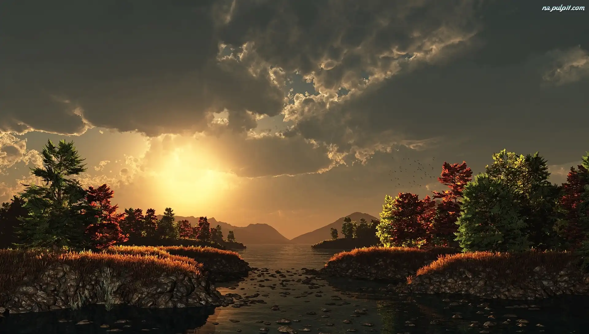 Rzeki, Kolorowe, Drzewa, Zachody, Góry, Słońca Na Pulpit