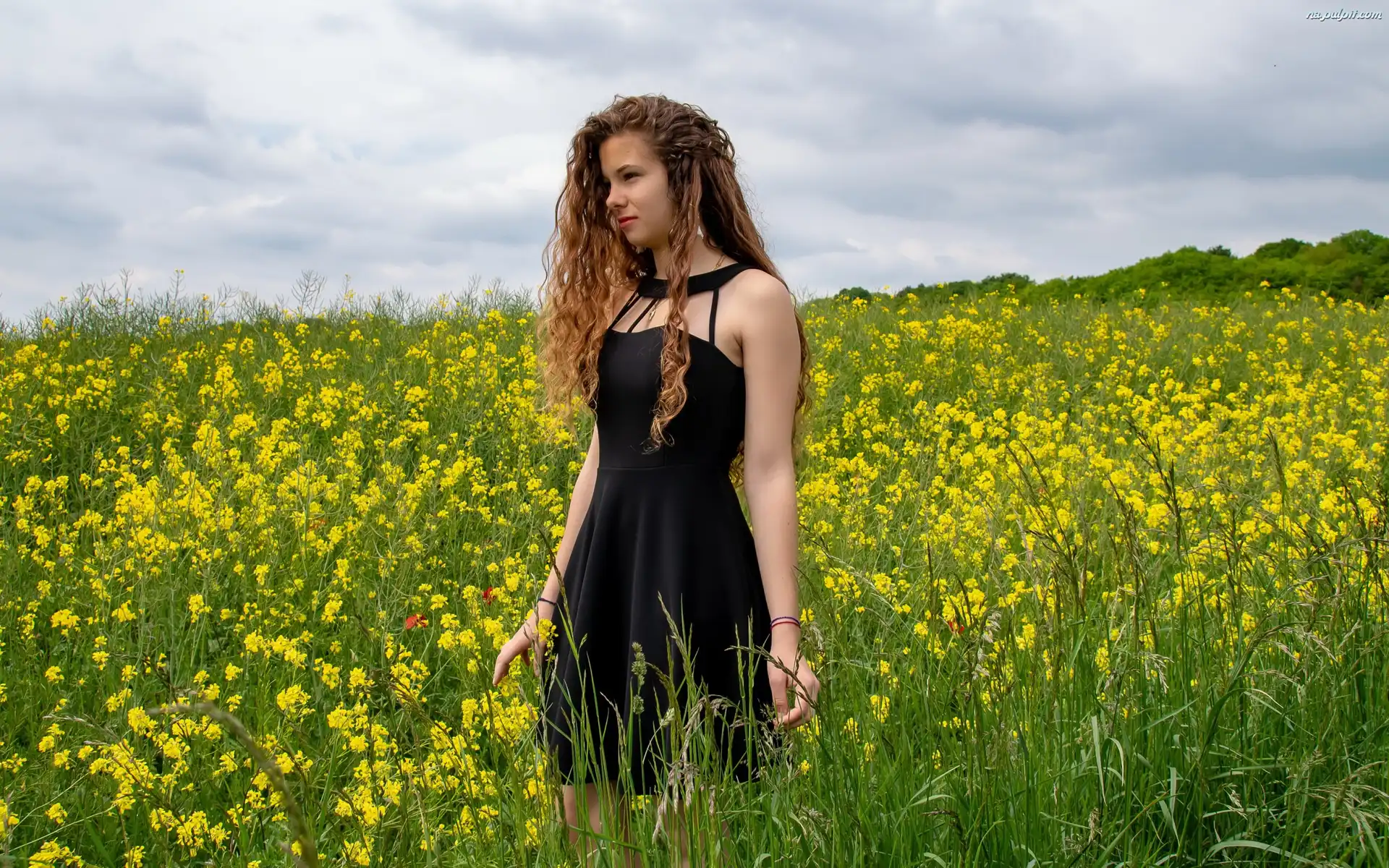 Rzepak, Sukienka, Czarna, Kobieta, Pole