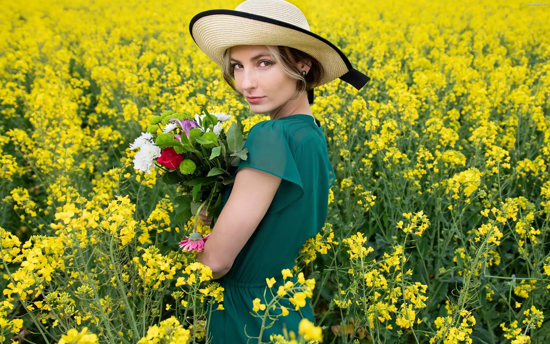 Rzepak, Bukiet kwiatów, Kapelusz, Kobieta, Pole Na Pulpit