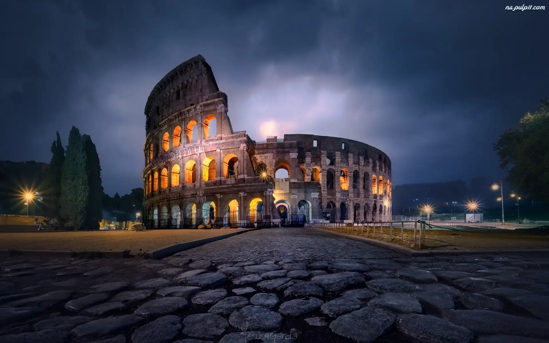 Drzewa, Rzym, Światła, Amfiteatr Flawiuszów, Koloseum, Włochy, Noc Na Pulpit