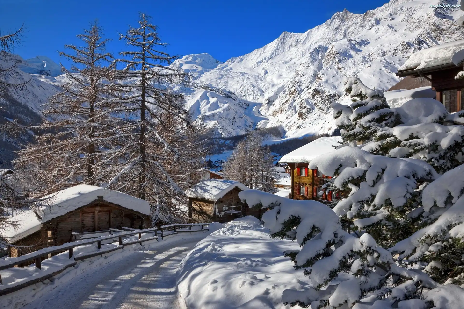 Droga, Saas-Fee, Domy, Góry, Zima, Szwajcaria, Wieś Na Pulpit