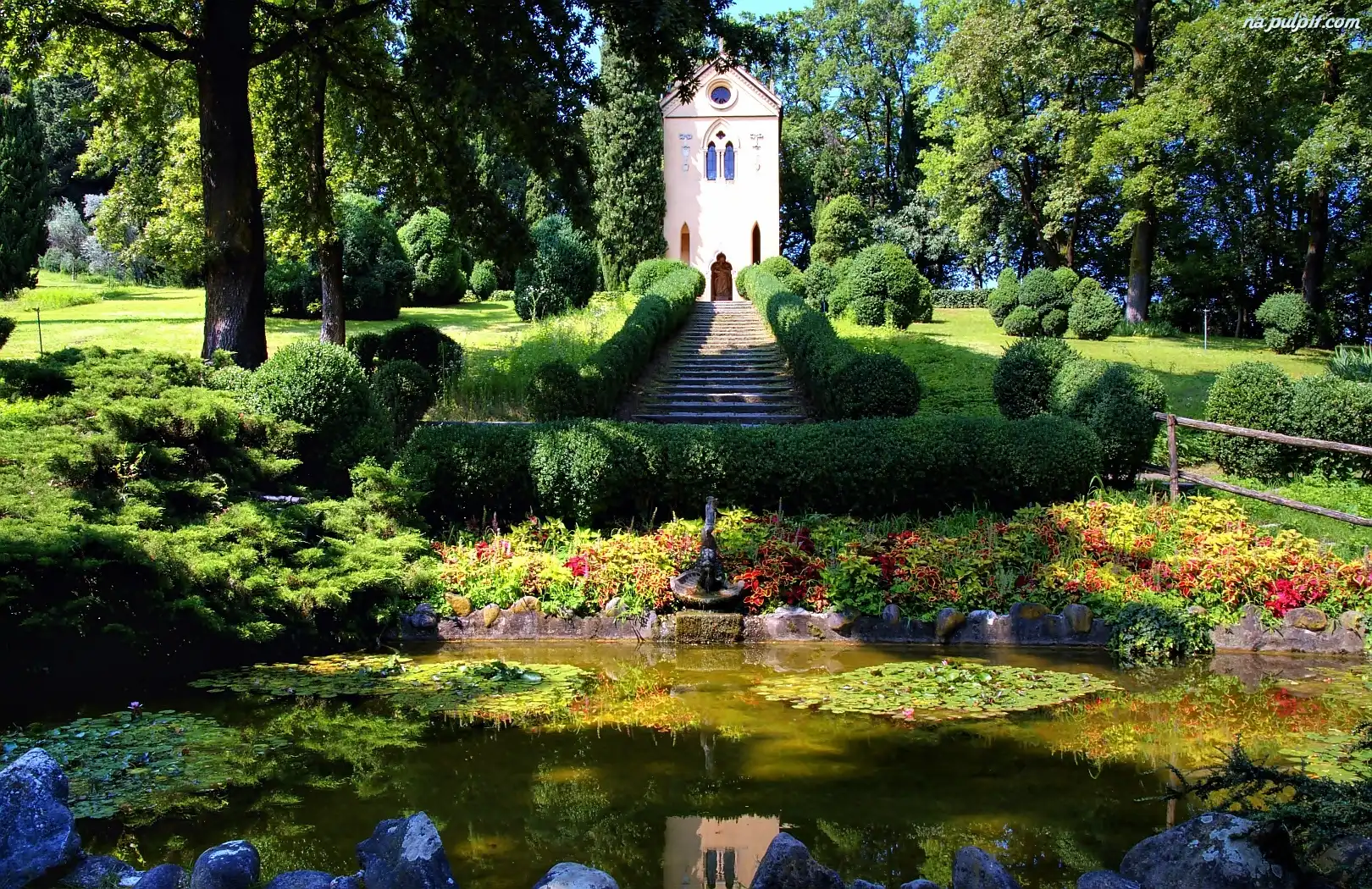 Sadzawka, Przebijające, Światło, Fontanna, Park, Kaplica