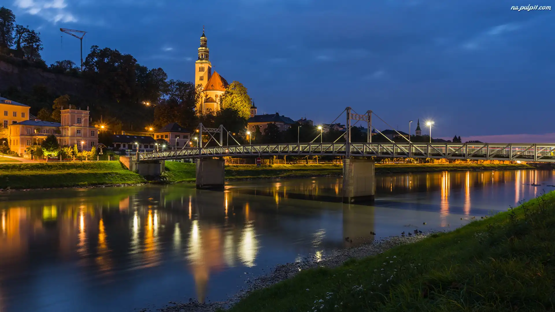 Most, Salzburg, Domy, Roślinność, Wieczór, Kościół, Austria, Rzeka Salzach Na Pulpit